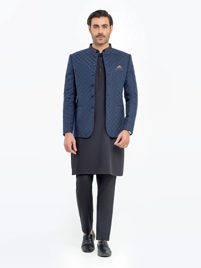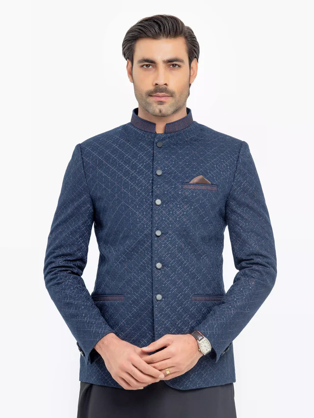 Navy blue color Prince coat made of embroidered fabric. This is a stylish and amazing outfit for men. This outfit will look amazing on valima functions. Contact us on WhatsApp to get more information about this garment.